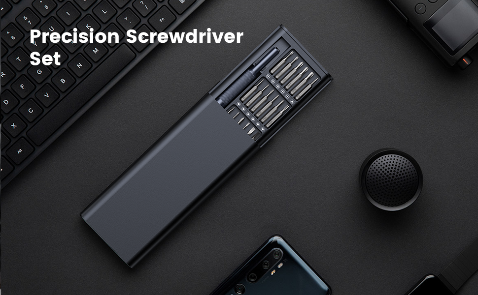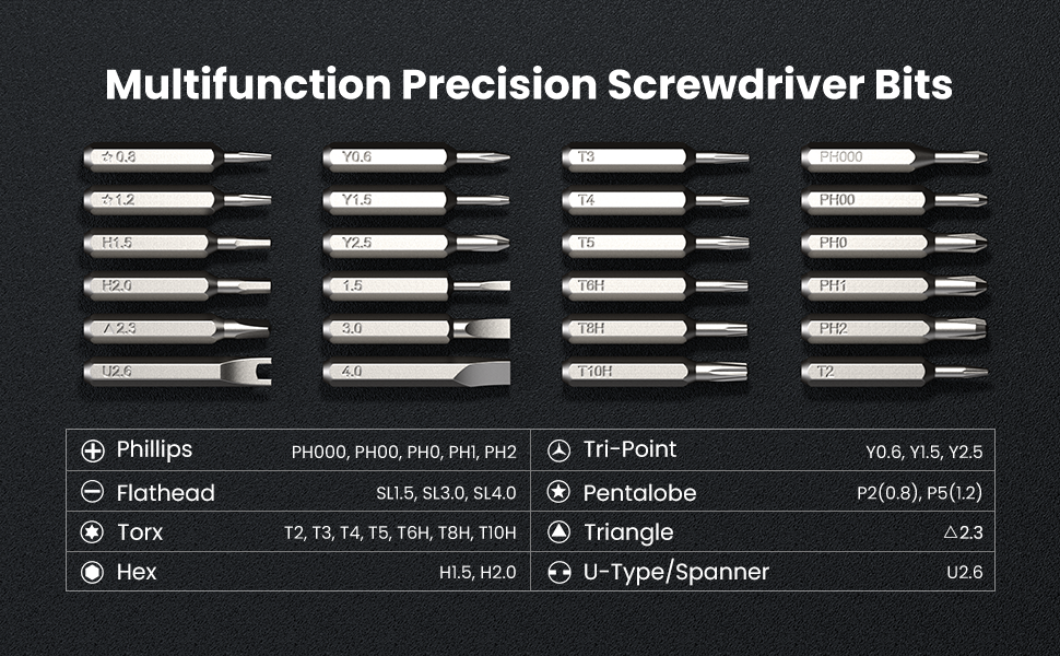 • [25in1, Household Must-Have] The small screwdriver set comes with 24 different bits (Phillips, Flat, Torx, Torx Security, Pentalobe, Hexagon, etc.), ensuring you have the smallest but complete set of repair kit.